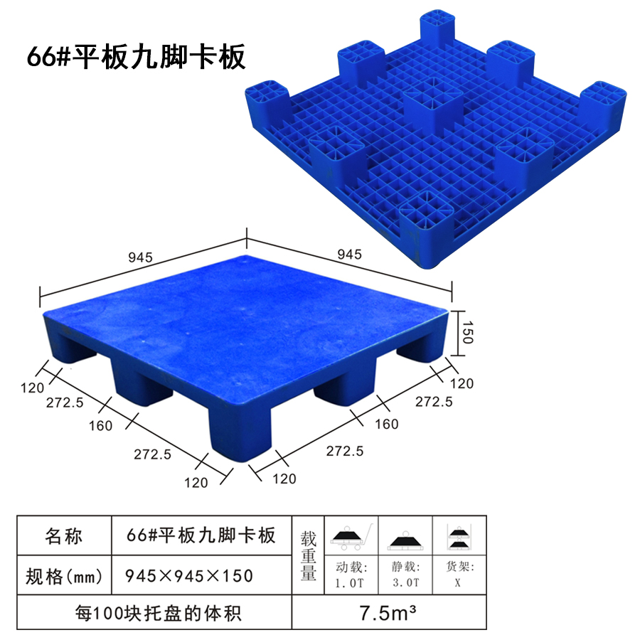 | Color | Low blue,blue,yellow,black,green,red,white,grey,other | Dynamic load | 1T | Material | PP,PE | Model | Four-way | Scope | Food pharmaceutical and chemical industries such as textile parts factory warehouse logistics transportation | size | 945×945×150 | Static load | 3T | Type | Single side | 100 volume | 7.5m3 | Shelf | X |